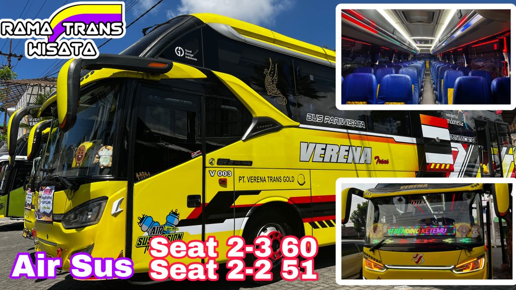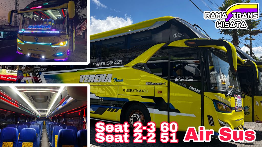 Bus Pariwisata Verena Trans semua berkapasitas 60 seat dengan konfigurasi seat 2-3, tetapi juga bisa di setting konfigurasi seat 2-2 atau berkapasitas maksimum 50 penumpang, Bus Pariwisata Verena Trans selalu berusaha memberikan pelayanan yang terbaik buat penumpang atau penyewa dengan menghadirkan bus terbaik di kelasnya dan di dukung dengan fasilitas bus yang lengkap dengan melengkapi setiap bus dengan wifi untuk video dan audio yang bisa di nikmati di setiap perjalanan bagi para wisatawan, serta di dukung oleh crew yang berpengalaman di Pariwisata